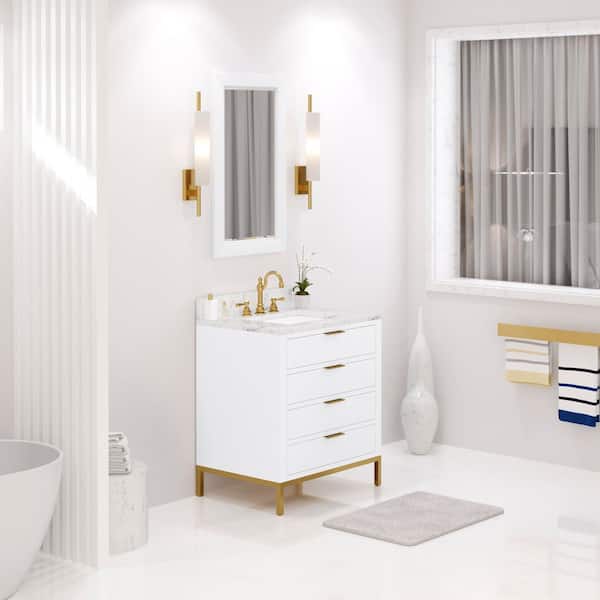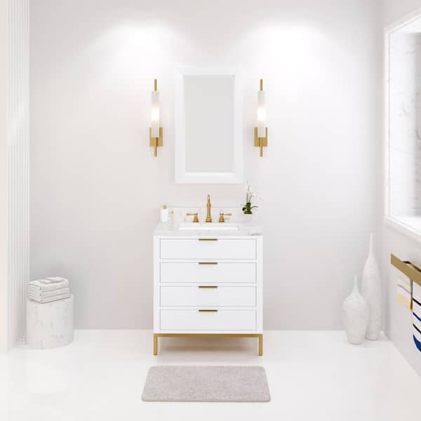 Bristol 30 in. W x 21.5 in. D Vanity in Pure White with Marble Top in White with White Basin and Hook Faucet