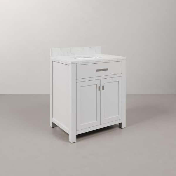 Madison 30 in. W x 21.5 in. D x 34 in. H Single Sink Bath Vanity in Pure White with Carrara White Marble Top and Mirror