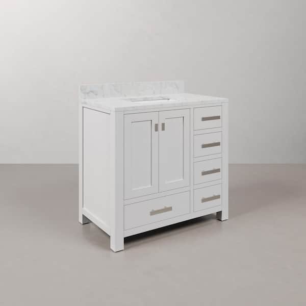 Madison 36 in. W x 21.5 in. D x 34 in. H Single Sink Bath Vanity in Pure White with Carrara White Marble Top and Mirror