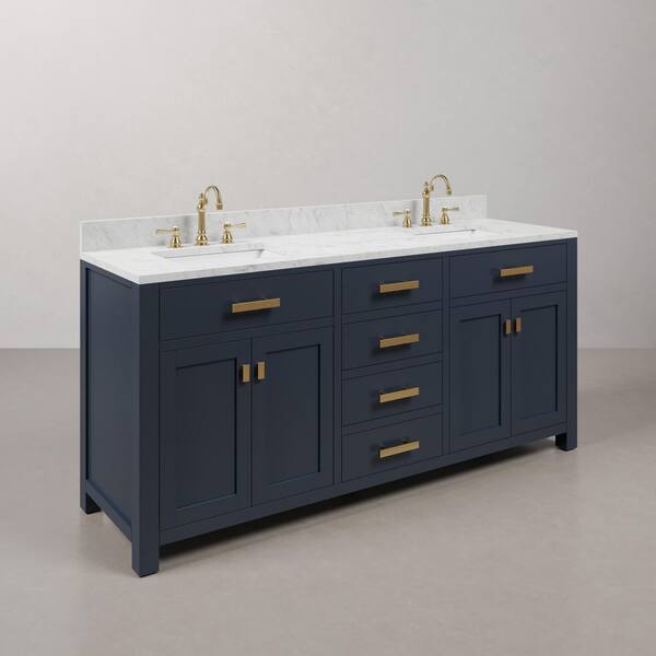 Madison 72 in.W x 21.5 in.D x 34 in.H Double Sink Bath Vanity in Monarch Blue with Carrara White Marble Top and Faucets