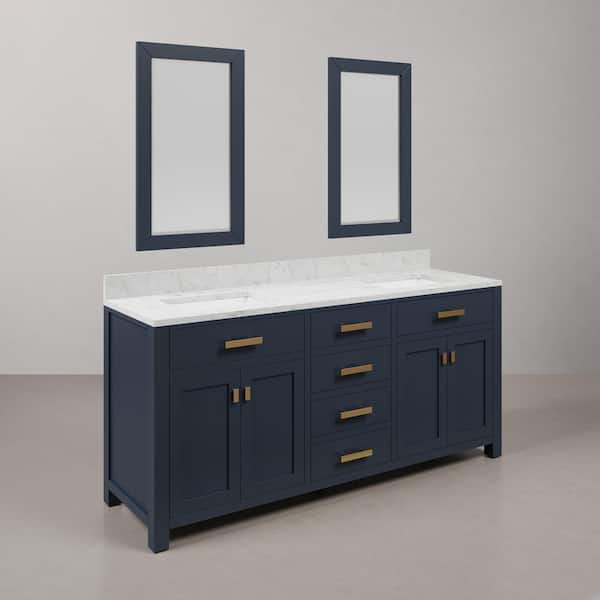 Madison 72 in.W x 21.5 in.D x 34 in.H Double Sink Bath Vanity in Monarch Blue with Carrara White Marble Top and Mirrors