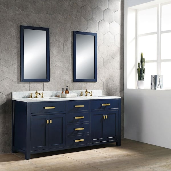 Madison 72in.Wx21.5in.Dx34in.H Double Sink Bath Vanity in Monarch Blue w/ Carrara White Marble Top, Faucets and Mirrors