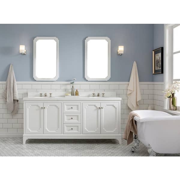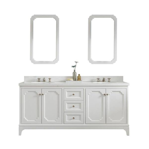 Queen 72 in. Pure White With Quartz Carrara Vanity Top With Ceramics White Basins and Mirror and Faucet