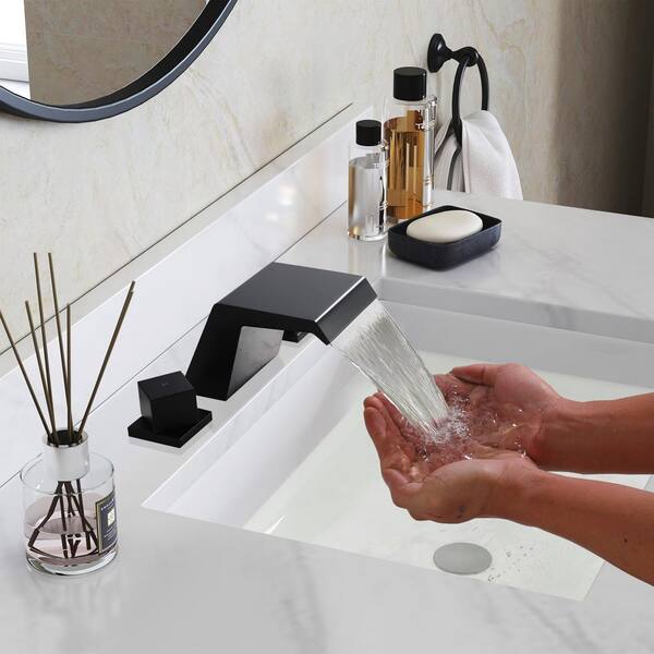 Water Saving Design Double Handles 8 in. Center Bathroom Faucet Waterfall Widespread Bathroom Faucet in Matte Black
