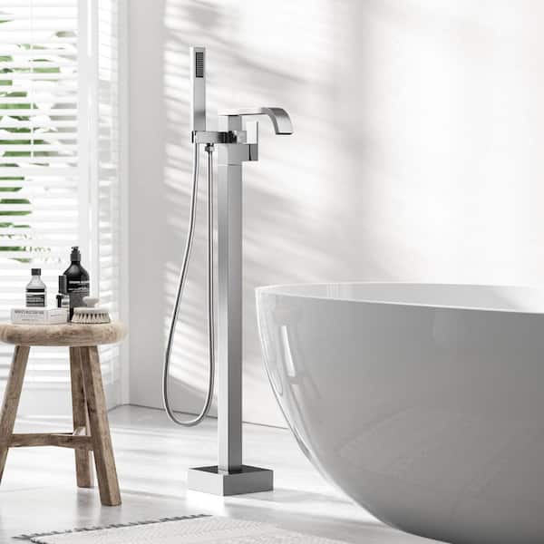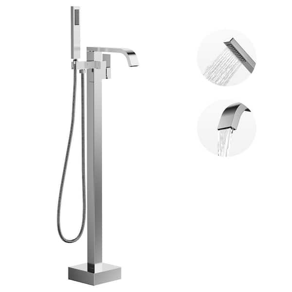 Waterfall Single-Handle Freestanding Tub Faucet with Handshower, Brass Floor Mounted Tub Filler Faucet in Brushed Nickel