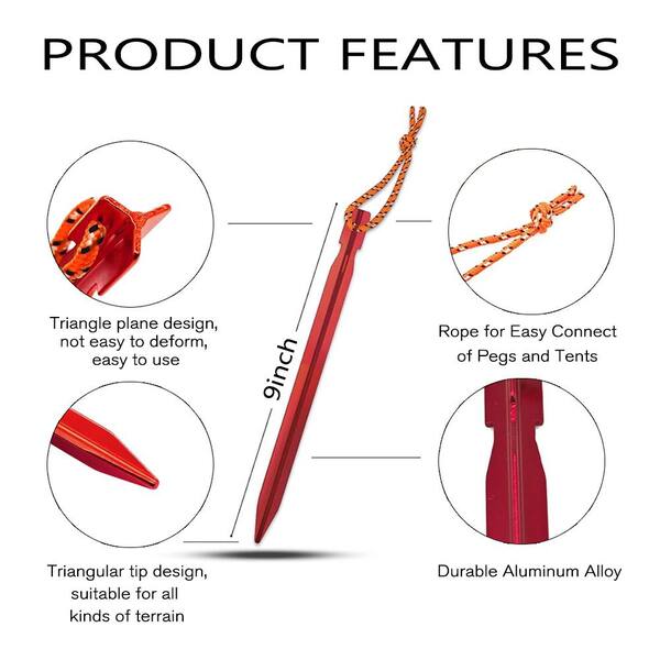 9 .2 in. Aluminum Alloy Red Triangular Tent Pegs Stake with Rope for Camping Tent (18-Pack)