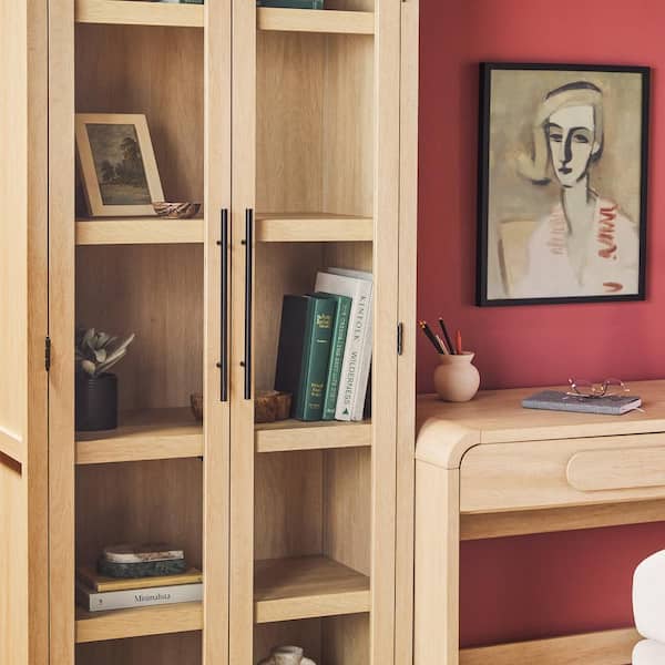 3-Piece Modern 38 in. Waterfall Coastal Oak Writing Desk with Curved Pull Drawers and 2 76 in. Glass Door Bookcases