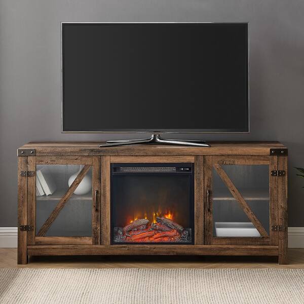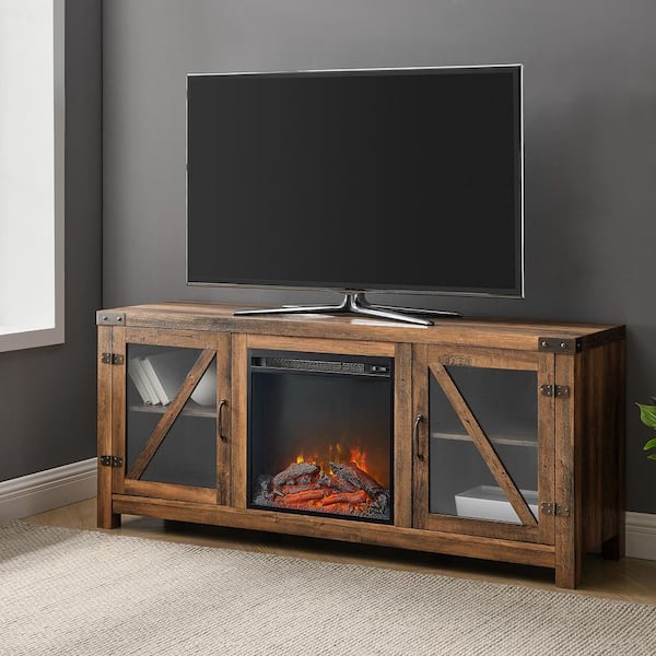 58" Glass Barn Door Composite Fireplace Console, Fits TVs up to 65 In. - Reclaimed Barnwood