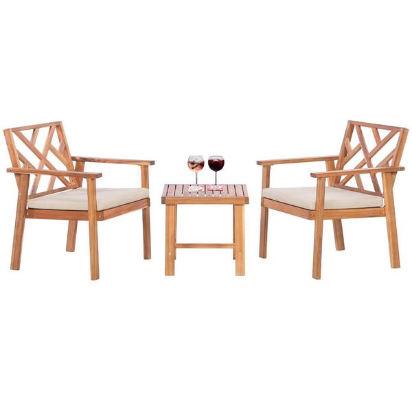 Brown 3-Piece Acacia Wood Patio Furniture Set with Light Gray Cushions