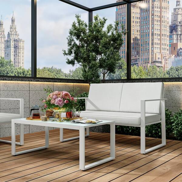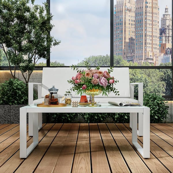 White 2-Piece Metal Patio Conversation Deep Seating Set w/ CushionGuard and Tempered Glass Coffee Table, White Cushions