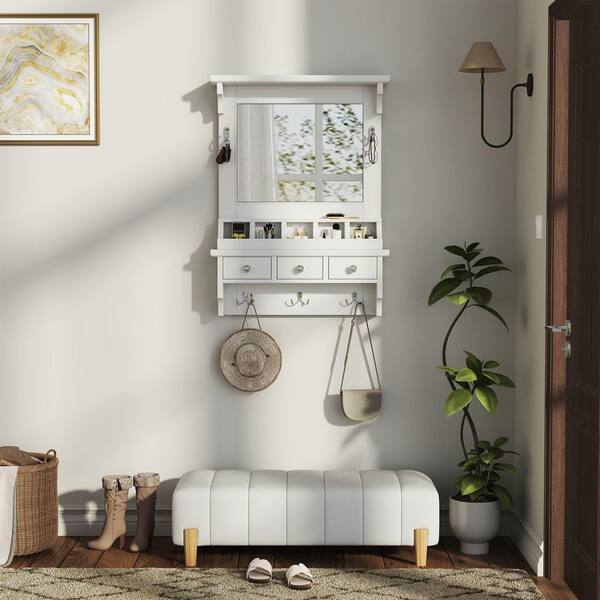 White 23.8 in W x 31.8 in. H Rectangle Wood Framed Floating Storage Vanity Mirror with Drawers and Hooks