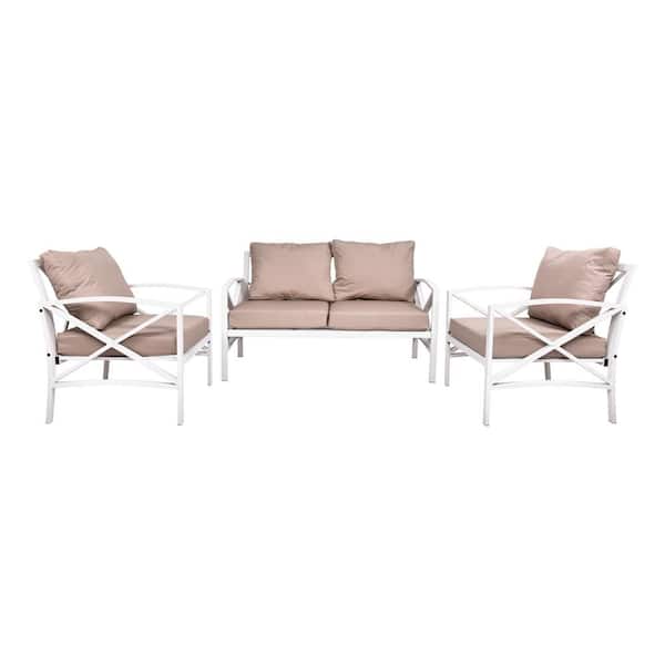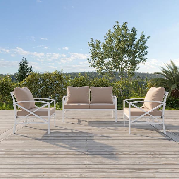 White 3-Piece Metal Patio Conversation Set with Beige Cushions