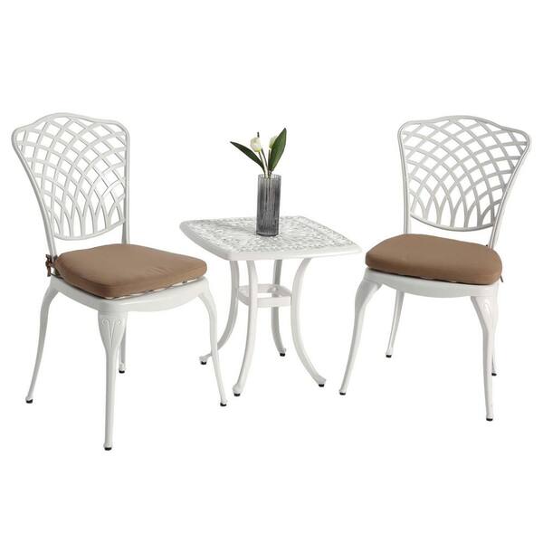 White 3-Piece Rustproof Cast Aluminum Outdoor Bistro Set with Brown Cushion, All Weather Patio Dining (Set of 3)