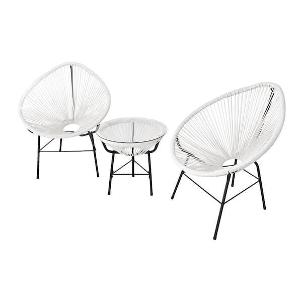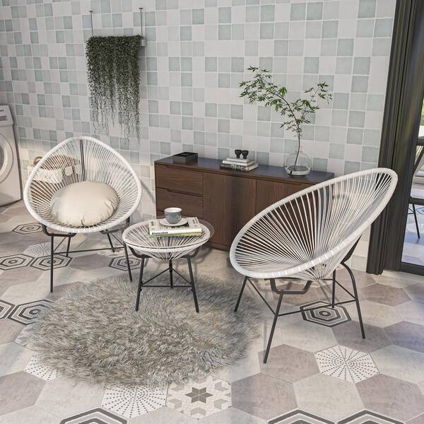 White 3-Piece Terrace PE Plastic Rattan Patio Conversation Bistro Set, 2 Chairs with Glass Top Coffee Table