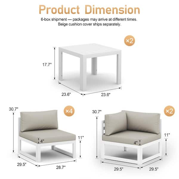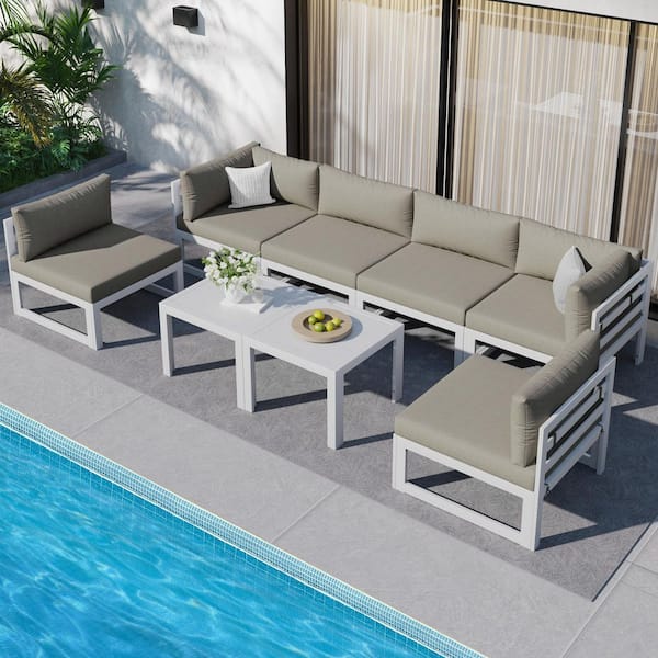 White 8-Piece Aluminum Outdoor Patio Conversation Sectional Deep Seating Sofa Set with Tables and Beige Cushions