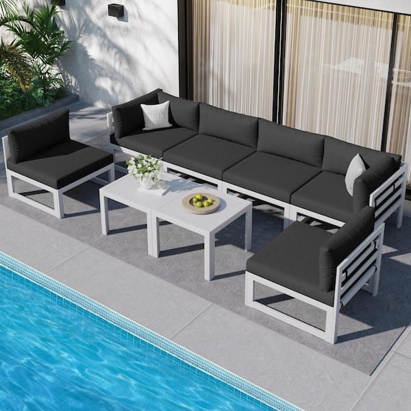 White 8-Piece Aluminum Outdoor Patio Conversation Sectional Deep Seating Sofa Set with Tables and Dark Gray Cushions