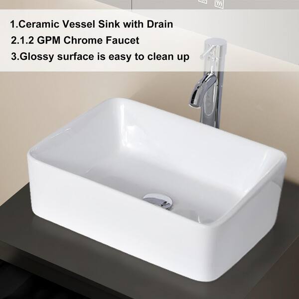 White Ceramics Rectangle Vessel Sink with Chrome Faucet Pop Up Drain Set