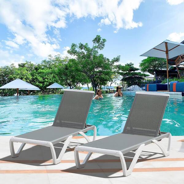 White Frame Adjustable 1-Piece Metal Outdoor Chaise Lounge with Plastic Pool in Grey