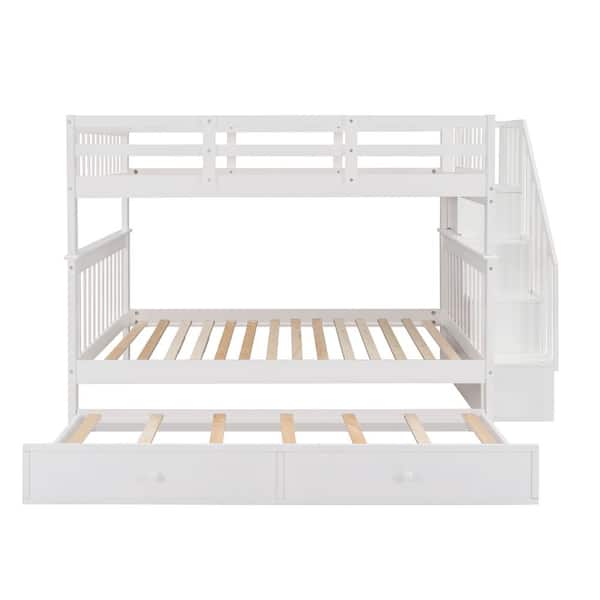 White Full Over Full Wood Bunk Bed with Twin Trundle and Bookshelves, Detachable Kids Bunk Bed with Staircases