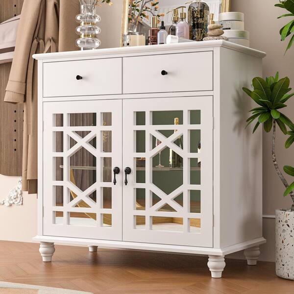 White MDF Wooden Accent Storage Cabinets, Sideboard, End Table with 2 Drawers, 2 Mirrored Doors & 2-Tier Shelves Inside