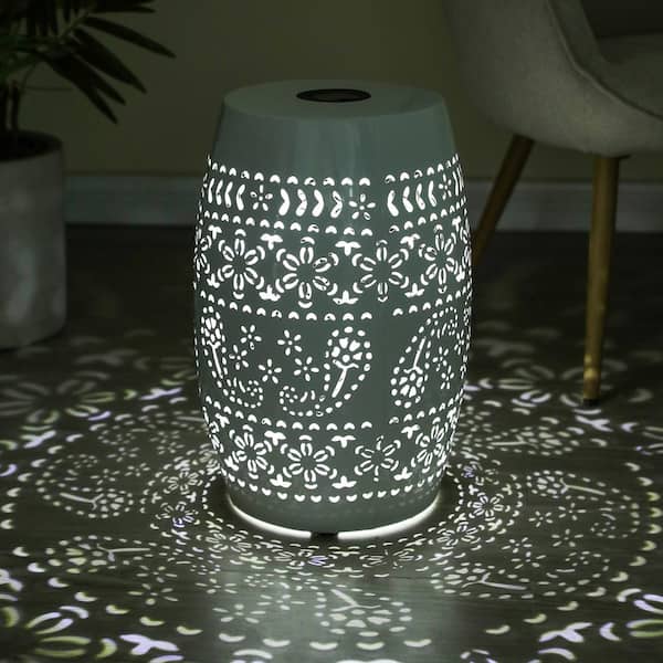 White Round Outdoor Side Table Solar End Table with Solar Powered Light