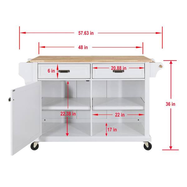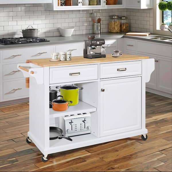 White Rubber Wood Kitchen Cart with Drop Leaf, 1-Door Cabinet, 2-Drawers, Spice Rack and Towel Rack