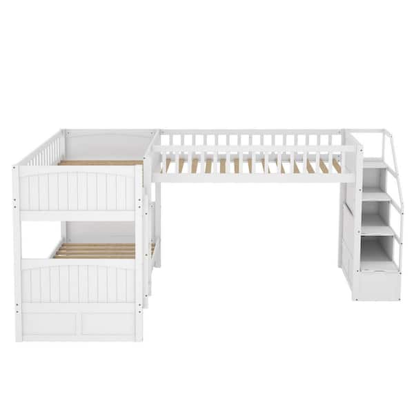 White Twin Over Twin Size Wooden L-Shaped Bunk Bed with Ladder and Stairway