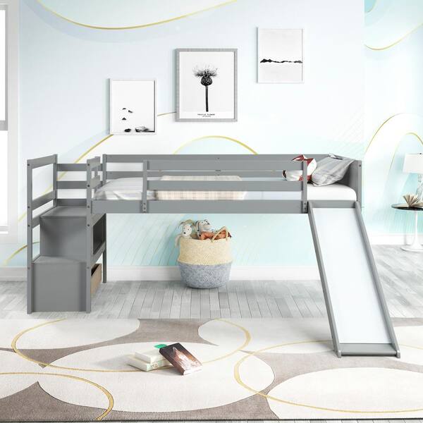 White Twin Size Wooden Loft Bed with Removable Slide, Storage Drawer and Stairs, Slide can be Put on Either Side