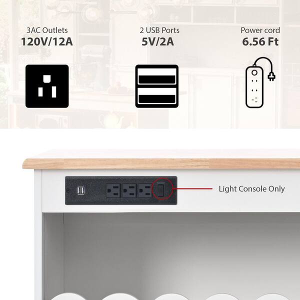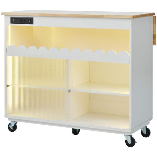 White Wood 44 in. Large Kitchen Island with Sliding Glass Door and LED Light