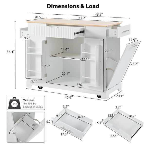 White Wood 48.5 in. Rolling Kitchen Island with Power Outlet and Trash Cabinet