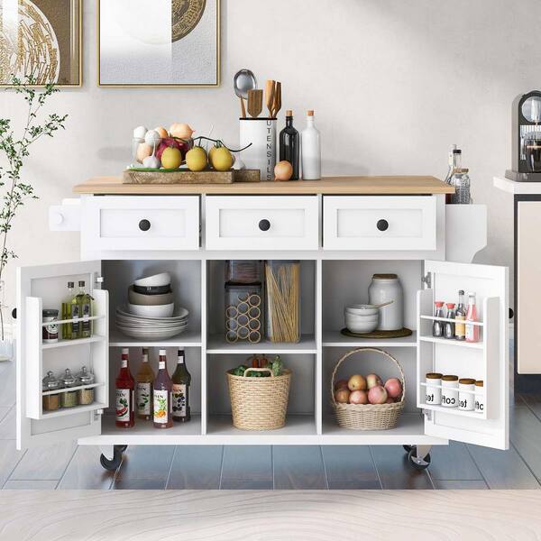 White Wood 53 in. W Kitchen Island Cart with Drop Leaf, 2-Storage Cabinets, 3-Drawers, and Storage Rack