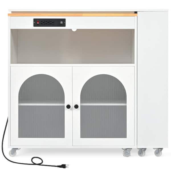 White Wood 56.3 in. Kitchen Island with LED Lights, Power Outlets, 2-Fluted Glass Doors and Side 3-Open Shelves