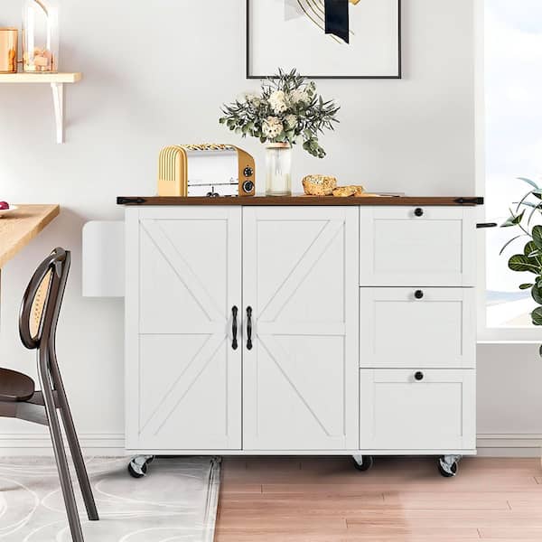 White Wood Countertop 54.5 in. Kitchen Island on 5 Wheels with 3 Drawers, Drop Leaf and Power Outlet