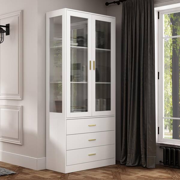 White Wooden Free Standing 31.5 in. Width Storage Cabinet, Bookcase with 3-Tier Shelves, Visable Doors and 3-Drawers