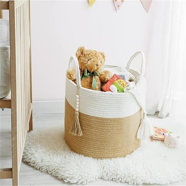 White and Yellow Woven Storage Basket Decorative Rope Basket with Handles