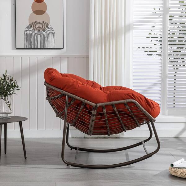 Wicker Indoor and Outdoor Rocking Chair with Orange Cushion for Front Porch, Living Room, Patio, Garden