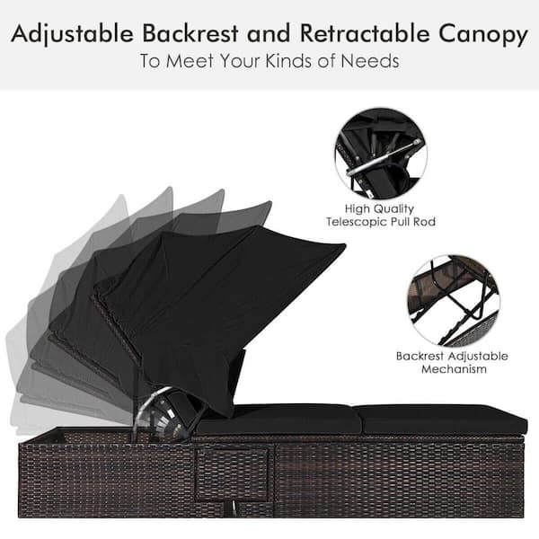 Wicker Outdoor Chaise Lounge Chair with Folding Canopy with Adjustable Black Cushions