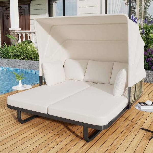 Wicker Outdoor Day Bed with Beige Cushions, Rattan Daybed with Retractable Canopy for Patio Backyard Porch Pool