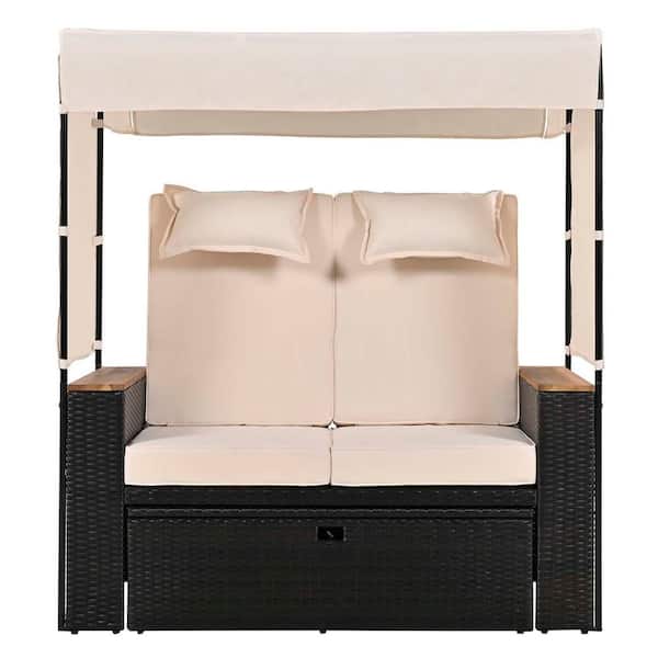 Wicker Outdoor Day Bed with Beige Cushions, Rattan Double Daybed Sunbed with Canopy for Poolside Garden Backyard Lawn