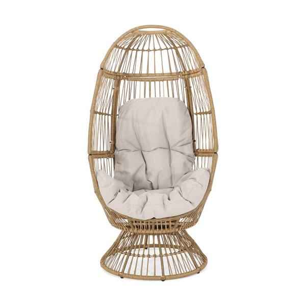 Wicker Outdoor Lounge Chair, Swivel Egg Chair With Water Resistant Beige Cushion for Porch, Balcony, Deck, Light Brown