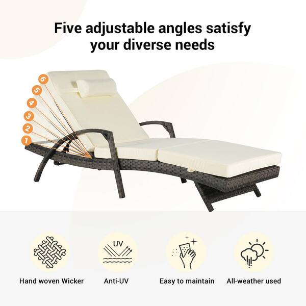 Wicker Outdoor Lounge Chair with Beige Cushions Adjustable 5-Position Patio Pool Lounge Chair with Arm Pillow (2-Pack)