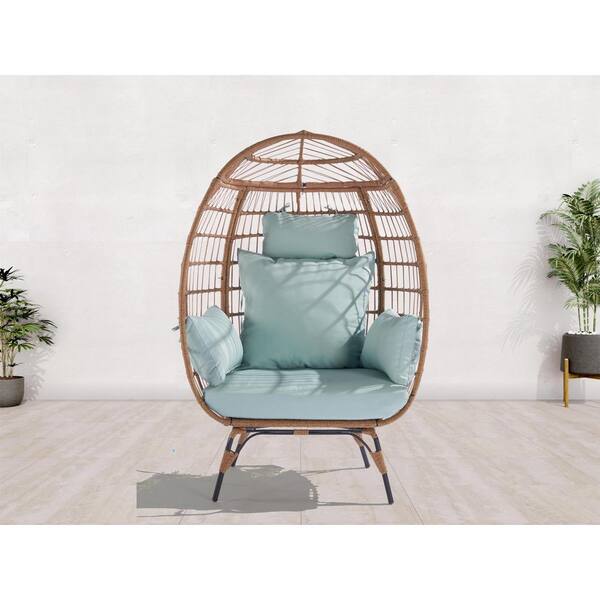 Wicker Outdoor Lounger Chair, Oversized Egg Chair for Patio, Backyard, Living Room with Light Blue Cushions, Steel Frame