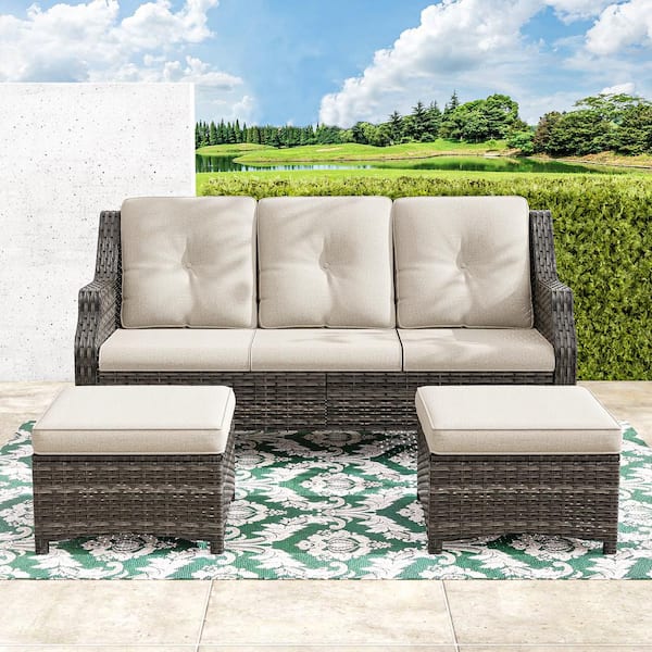 Wicker Outdoor Patio Sofa Sectional Set with Beige Cushions and Ottoman