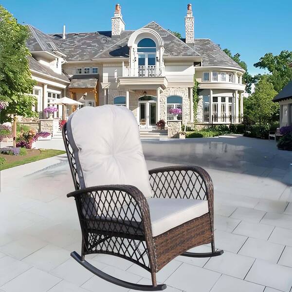 Wicker Outdoor Rocking Chair Patio Rattan Rocker Chair Lounge Chair with Padded Grey Cushion