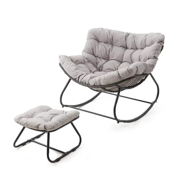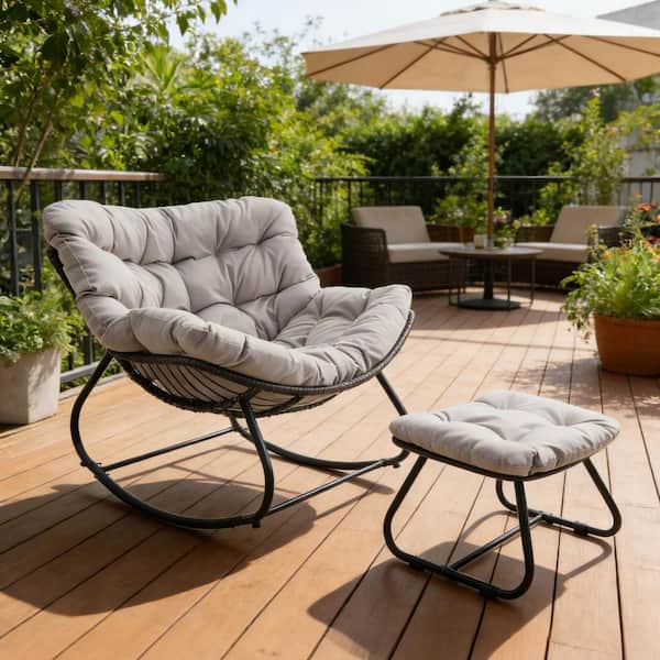 Wicker Outdoor Rocking Chair with Light Gray Cushions and Ottoman