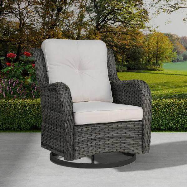 Wicker Rattan Gray Patio Outdoor Rocking Chair Swivel with Beige Cushions (Set of 1)