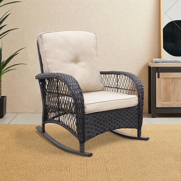 Wicker Rattan Woven Outdoor Rocking Chair with Beige Cushion for Backyard, Porch