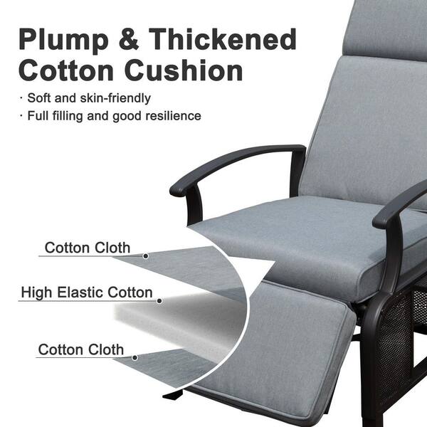 Black Adjustable Metal Frame Outdoor Patio Recliner with Extendable Side Table, Retractable Footrest and Gray Cushion