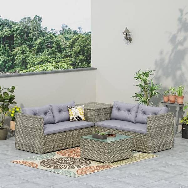 4-Piece Wicker Patio Conversation Sofa Seating Set with Gray Cushions, Storage Box