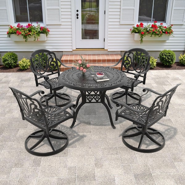 Elizabeth 5-Piece Cast Aluminum Patio Outdoor Dining Set with Round Dining Table, 4 Swivel Chairs and 4 Brown Cushions